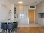 Apartman na dan DON VITO je luksuzni smeštaj na Novom Beogradu, sa lokacijom u novom delu bloka 45, nadomak popularne Piramide. Pred Vama je komforan i moderno uređen studio, preporučen za dvoje posetilaca. Kao apartman u novoj zgradi, ovaj stan se može pohvaliti novim nameštajem i pratećom opremom. Pored kvalitetnih materijala i besprekornog dizajna, primećujemo ukrasne predmete i efektnu zidnu aplikaciju. Spavaće akomodacije čini raskošan bračni krevet i udobna sofa koja može poslužiti kao dodatni ležaj. Na krevetu ćete pronaći uredno složen komplet čistih peškira. Pažnju zaokupljaju uzani kafe-stolić i šarmantne stolice trouglastog oblika. Jednako je zanimljiv i trpezarijski sto sa pridruženim ergonomskim stolicama. Na susednom zidu vidimo dve police sa simpatičnim ukrasima. Kuhinjski odeljak je sveden na kabinete, indukcionu plotnu i aparat za kafu, što je za potrebe kraćeg boravka sasvim adekvatno. Kupatilo je vrlo komotno, blistavo čisto i obrađeno kvalitetnom keramikom. Klasična kada, bojler, veš mašina i ugradne sanitarije spremne su za korišćenje. Dodajmo da apartman ima prostranu terasu sa pogledom na dinamični bulevar. Tapacirane stolice i kafe-stolić obećavaju prijatne trenutke uz ćaskanje i piće.